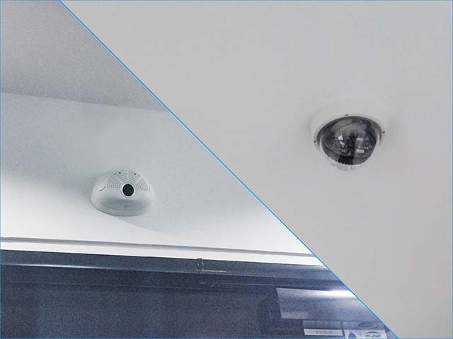 Diese Kameras eignen sich für Situationen, an denen es um die Gesamterfassung geht. In großen Hallen und Sälen bietet sich dieses Modell an, da es unauffällig große Areale erfasst. Bei der Aufzeichnung wird das gesamte Bild erfasst. Über eine Software werden vier Bereiche 90 nahezu verzerrungsfrei angezeigt.